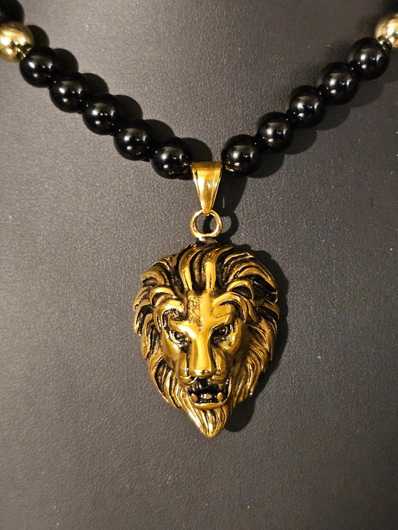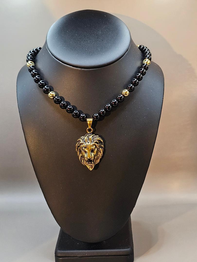 Lion of Judah Black Onyx and Gold Beaded Necklace Unisex